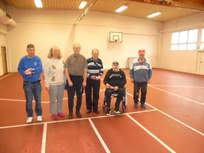 1.3.2025 Jäsentenväliset bocciakilpailut Toimintakeskuksessa. Kuva yleinen sarja. Vaemmalta 2. Mika Taimi, 1. Leena Hällfors, 3. Harry Haapnen, 4. Vilho Kiho, 5. Tommi Ojala, 6. Simo Suomi