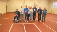 1.3.2025 Jäsentenväliset bocciakilpailut Toimintakeskuksessa. Kuva yleinen sarja. Vaemmalta 2. Mika Taimi, 1. Leena Hällfors, 3. Harry Haapnen, 4. Vilho Kiho, 5. Tommi Ojala, 6. Simo Suomi