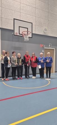 24.1.2026 Eurajoki bocciakilpailu. Kuvassa naisten palkintojen jako. Vasemmalta 2. Seija Kuula JoLi/Raija Uusi-Marttila Eurajoen ES. 1. Sari Haapala/Liisa Kaurila 3. Onerva Uuttera/Hilkka Flyktman Mäntän ES, 4. Tuija Leino/Taina Mäkilä Rauman ES