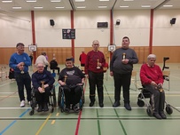 1.3.2025 Jäsentenväliset bocciakilpailut Toimintakeskuksessa. Kuva vajaakuntoiset. Vasemmalta 2. Eila Lahtinen, 1. Heikki Kuusisto, 3. Mikko Laiho, 4. Samuli Palmu, 5. Airi Hyötilä, 6. Petri Aronpää